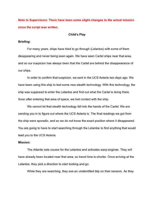 This PDF outlines a mission script for Discovery Space Center Supervisors in which a crew investigates the disappearance of the UCS Asteria and becomes trapped inside an advanced alien testing facility disguised as a space mission. The scenario unfolds over three escalating stages—physical combat, mental riddles under threat, and a strategic maze—designed to test teamwork, leadership, problem-solving, and ethical decision-making under pressure. The mission culminates in a moral dilemma and coordinated technical challenge, emphasizing supervision skills, crew coordination, and adaptability in high-stress, story-driven environments.